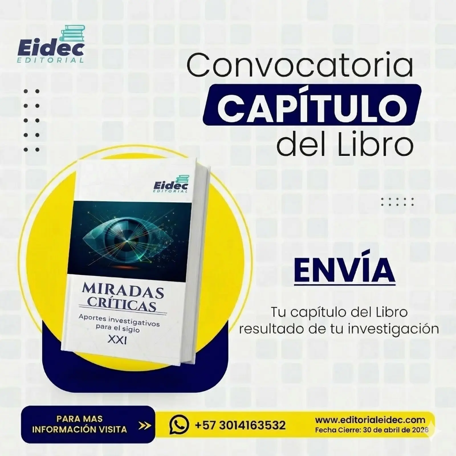 ¿Tienes resultados de investigación que merecen ser publicados? Esta es tu oportunidad para darles visibilidad. Participa enviando tu capítulo y forma parte de una obra colectiva que reúne aportes significativos para el análisis y la construcción de conocimiento en el siglo XXI.